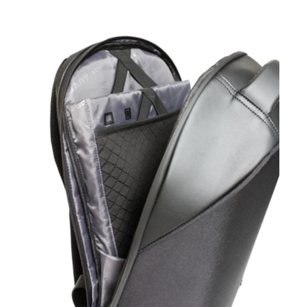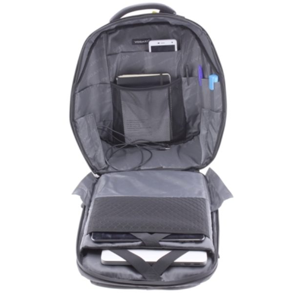 A Vogart lopásbiztos laptophátizsák vízlepergető anyagból készült. Kézben és szivacsos, állítható vállpántjainak, valamint szintén szivacsos hátrészének köszönhetően háton kényelmesen hordható, a bőröndkulira ráhúzható. A laptophátizsák 1 főrekesszel bír, melyben szivacsos iPad-, illetve (15,4″-os) laptoptartót találunk. Beépített USB porttal és Jack dugóval rendelkezik, így kényelmesen töltheti a telefonját, vagy hallgathat zenét (belülről csatlakoztasson egy külső akkumulátort az USB porthoz/zenelejátszót a Jack dugóhoz, kívülről pedig a telefont/fülhallgatót). Ezeken felül több kisebb rekesz is található a hátizsákban, pénztárca, telefon, kulcsok és egyéb holmik számára. Lopás elleni védelem a rejtett cipzáraknak köszönhetően, melyek segítenek megvédeni a táskában lévő értékeit. Titka, hogy nem látható, hogy hol nyílik a táska, hiszen a cipzárak a hát felőli oldalon találhatóak. Anyagát nehezebb átvágni,mint egy hétköznapi táskának. Vastag fala van a megfelelő védelem érdekében, súlya mégis könnyű, nem nehezíti el a hátat, kényelmesen viselhető.